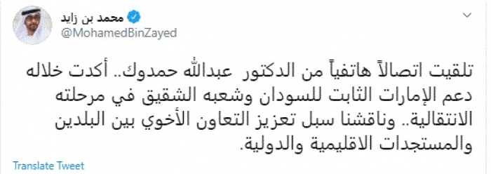 وقال في تغريدة عبر "تويتر" رصدها "المشهد العربي": "تلقيت اتصالاً هاتفياً من الدكتور عبدالله حمدوك.. أكدت خلاله دعم الإمارات الثابت للسودان وشعبه الشقيق في مرحلته الانتقالية".