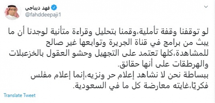 شن المحلل السياسي السعودي فهد ديباجي، اليوم، هجومًا حادًا على قناة الجزيرة القطرية.