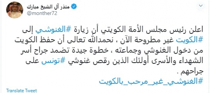 وقال في تغريدة عبر "تويتر" رصدها "المشهد العربي": "أعلن رئيس مجلس الأمة الكويتي أن زيارة الغنوشي إلى الكويت غير مطروحة الآن".