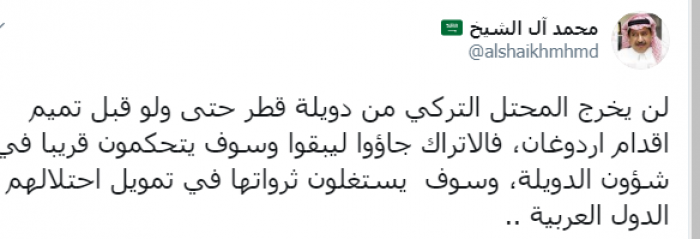 فتح الكاتب السعودي محمد آل الشيخ، اليوم السبت، النار على النظام التركي، مؤكدا أنه سيستغل ثروات قطر في تمويل احتلاله للدول العربية.