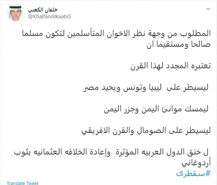 الكعبي مُهاجمًا الإخوان: يُريدون إعادة الخلافة العثمانية بثوب أردوغاني