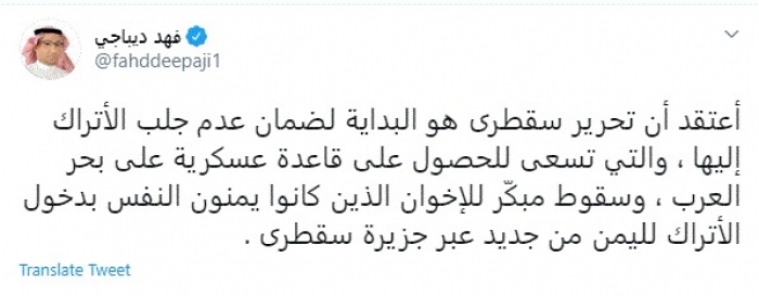 وكتب في تغريدة عبر "تويتر" رصدها "المشهد العربي": "اعتقد أن تحرير سقطرى هو البداية لضمان عدم جلب الأتراك إليها، والتي تسعى للحصول على قاعدة عسكرية على بحر العرب".