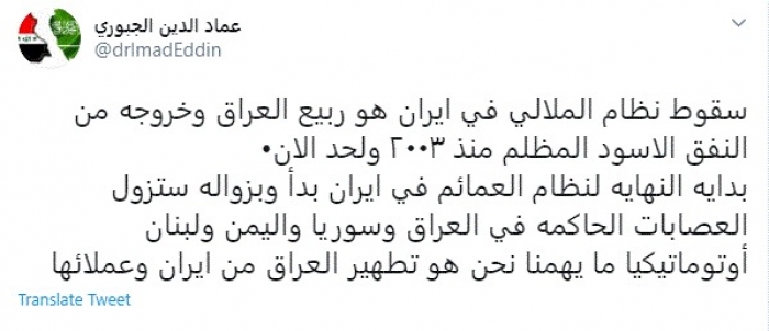 وقال في تغريدة عبر "تويتر" رصدها "المشهد العربي": "سقوط نظام الملالي في إيران هو ربيع العراق وخروجه من النفق الأسود المظلم منذ 2003 ولحد الآن".