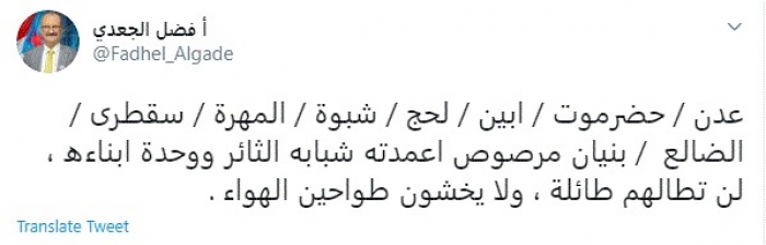 وقال في تغريدة عبر "تويتر" رصدها "المشهد العربي": "عدن / حضرموت / أبين / لحج / شبوة / المهرة / سقطرى / الضالع / بنيان مرصوص أعمدته شبابه الثائر ووحدة أبناءه، لن تطالهم طائلة، ولا يخشون طواحين الهواء".