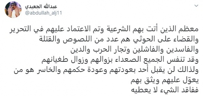 وقال في تغريدة عبر "تويتر" رصدها "المشهد العربي": "معظم الذين أتت بهم الشرعية وتم الاعتماد عليهم في التحرير والقضاء على الحوثي هم عدد من اللصوص والقتلة والفاسدين والفاشلين وتجار الحرب والدين".