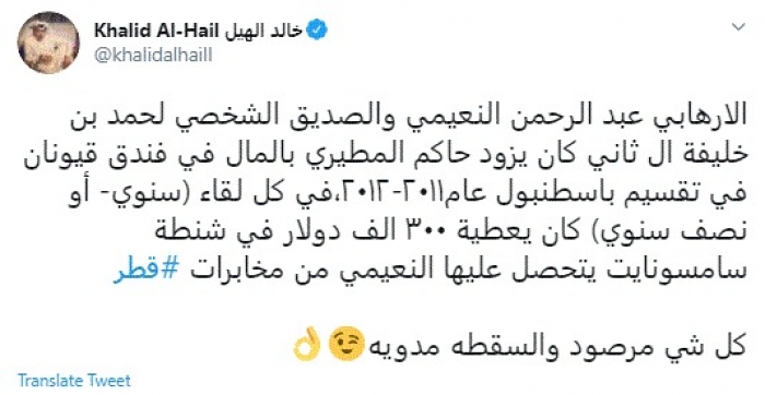 وأضاف: "في كل لقاء (سنوي- أو نصف سنوي) كان يعطية ٣٠٠ ألف دولار في شنطة سامسونايت يتحصل عليها النعيمي من مخابرات قطر كل شئ مرصود والسقطة مدوية".