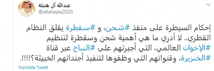 أكد الكاتب الصحفي السعودي عبدالله آل هتيلة، اليوم، أن النظام القطري قلق بسبب السيطرة على سقطرى وإنهاء الوجود الإخواني هُناك.