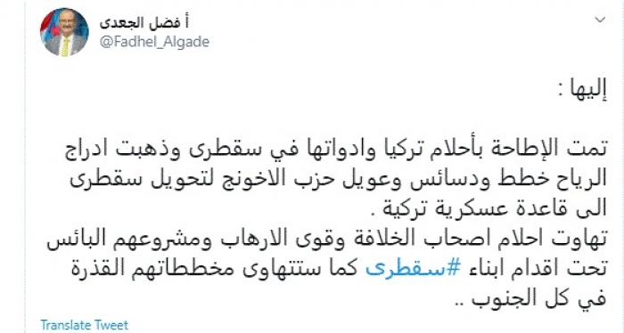 الجعدي: أحلام تركيا وأدواتها في سقطرى ذهبت أدراج الرياح