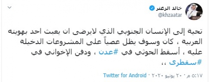 وكتب "الزعتر" في تغريدة رصدها "المشهد العربي": "تحية إلى الإنسان الجنوبي الذي لايرضى أن يعبث أحد بهويته العربية ، كان وسوف يظل عصيًا على المشروعات الدخيلة عليه، أسقط الحوثي في عدن، ودفن الإخواني في سقطرى".