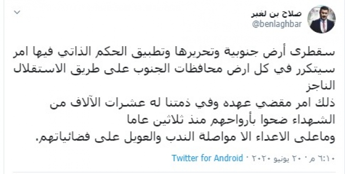 وكتب "بن لغبر" في تغريدة عبر حسابه بتويتر، رصدها "المشهد العربي": "سقطرى أرض جنوبية وتحريرها وتطبيق الحكم الذاتي فيها أمر سيتكرر في كل أرض محافظات الجنوب على طريق الاستقلال الناجز".