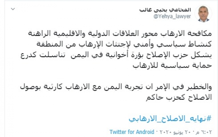 وأضاف: "يشكل حزب الإصلاح بؤرة إخوانية في اليمن تناسلت كدرع حماية سياسية للإرهاب".