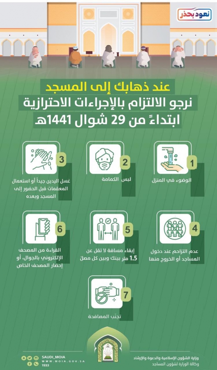 كما ينص على رفع المصاحف والكتب مؤقتًا، وإلزام المصلين على ترك مسافة متر ونصف بين كل مصلٍ وآخر من جميع الجهات، والتأكيد على إغلاق جميع برادات وثلاجات المياه، وعدم السماح بتوزيع المياه أو المأكولات في المسجد أو أي شيء آخر من طيب وسواك، وإغلاق دورات المياه وأماكن الوضوء.