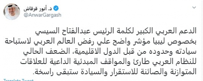 وقال في تغريدة عبر "تويتر" رصدها "المشهد العربي": "الدعم العربي الكبير لكلمة الرئيس عبدالفتاح السيسي بخصوص ليبيا مؤشر واضح علي رفض العالم العربي لاستباحة سيادته وحدوده من قبل الدول الإقليمية".
