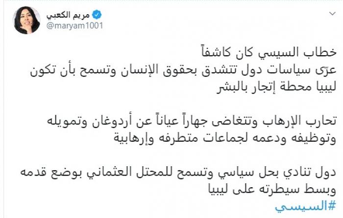 أشادت الكاتبة والإعلامية الإماراتية مريم الكعبي، اليوم، بالخطاب الذي ألقاه الرئيس المصري عبدالفتاح السيسي بشأن الأزمة الليبية، مؤكدةً أنه كشف دول تسمح للمحتل العثماني بالسيطرة على ليبيا.