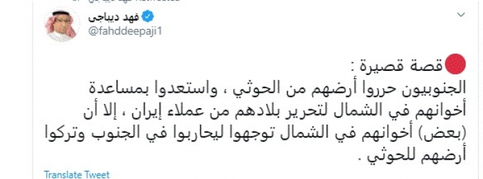 علق المحلل السياسي السعودي فهد ديباجي، اليوم، على محاربة بعض أبناء الشمال للجنوبيين وترك أرضهم لمليشيات الحوثي الإرهابية.