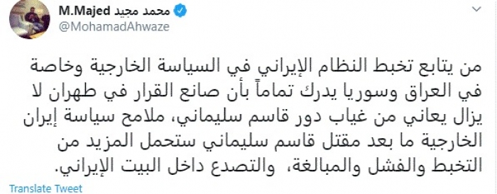 قال الكاتب الصحفي محمد مجيد الأحوازي، اليوم، إن السياسة الخارجية الإيرانية تُعاني بعد مقتل قاسم سليماني، متوقعًا زيادة التصدع داخل البيت الإيراني.