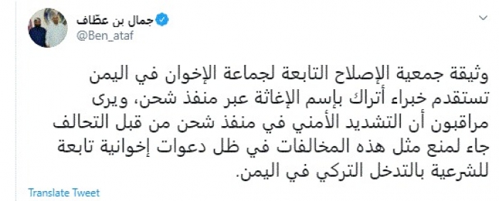 وكتب في تغريدات عبر "تويتر" رصدها "المشهد العربي": "وثيقة جمعية الإصلاح التابعة لجماعة الإخوان في اليمن تستقدم خبراء أتراك بإسم الإغاثة عبر منفذ شحن، ويرى مراقبون أن التشديد الأمني في منفذ شحن من قبل التحالف جاء لمنع مثل هذه المخالفات في ظل دعوات إخوانية تابعة للشرعية بالتدخل التركي في اليمن".