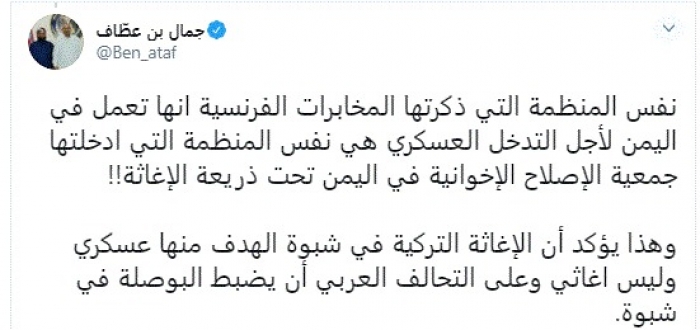 وأضاف: "نفس المنظمة التي ذكرتها المخابرات الفرنسية انها تعمل في اليمن لأجل التدخل العسكري هي نفس المنظمة التي أدخلتها جمعية الإصلاح الإخوانية في اليمن تحت ذريعة الإغاثة".