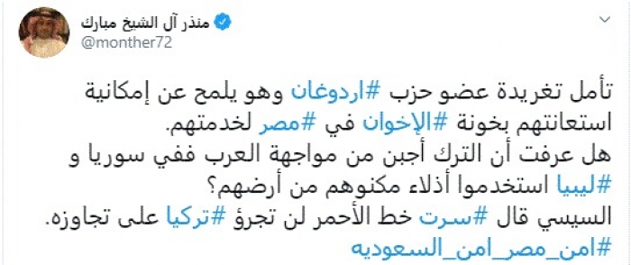 وكتب في تغريدة عبر "تويتر" رصدها "المشهد العربي": "تأمل تغريدة عضو حزب أردوغان وهو يلمح عن إمكانية استعانتهم بخونة الإخوان في مصر لخدمتهم".