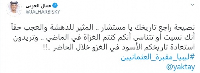 وقال في تغريدة عبر "تويتر" رصدها "المشهد العربي": "نصيحة راجع تاريخك يا مستشار.. المثير للدهشة والعجب حقاً أنك نسيت أو تتناسى أنكم كنتم الغزاة في الماضي.. وتريدون استعادة تاريخكم الأسود في الغزو خلال الحاضر".