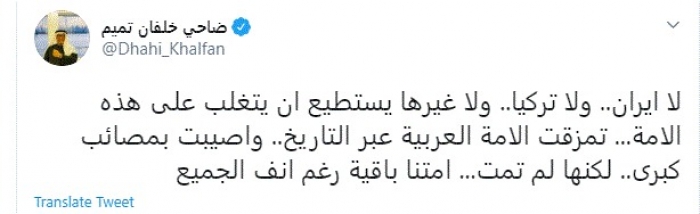وكتب في تغريدة عبر "تويتر" رصدها "المشهد العربي": "لا إيران.. ولا تركيا.. ولا غيرها يستطيع أن يتغلب على هذه الأمة.. تمزقت الأمة العربية عبر التاريخ.. وأصيبت بمصائب كبرى.. لكنها لم تمت... أمتنا باقية رغم أنف الجميع".