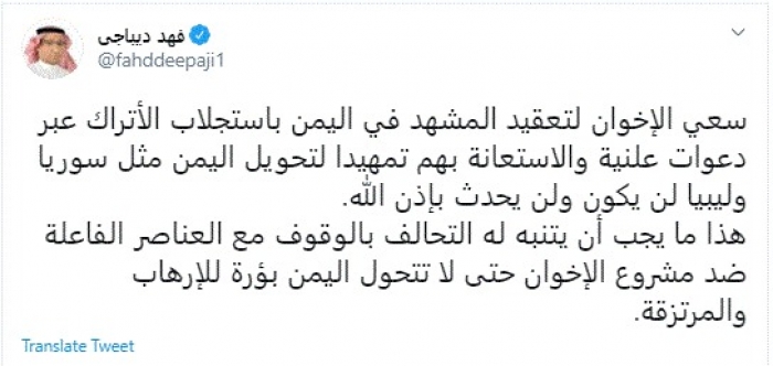 وكتب في تغريدة عبر "تويتر" رصدها "المشهد العربي": "سعي الإخوان لتعقيد المشهد في اليمن باستجلاب الأتراك عبر دعوات علنية والاستعانة بهم تمهيدًا لتحويل اليمن مثل سوريا وليبيا لن يكون ولن يحدث بإذن الله".