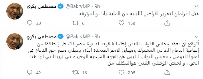 وقال في تغريدة عبر "تويتر" رصدها "المشهد العربي": "أتوقع أن يعقد مجلس النواب الليبي اجتماعا قريبا لدعوة مصر للتدخل انطلاقا من اتفاقية الدفاع العربي المشترك وميثاق الأمم المتحده الذي يعطي مصر حق الدفاع عن أمنها القومي".