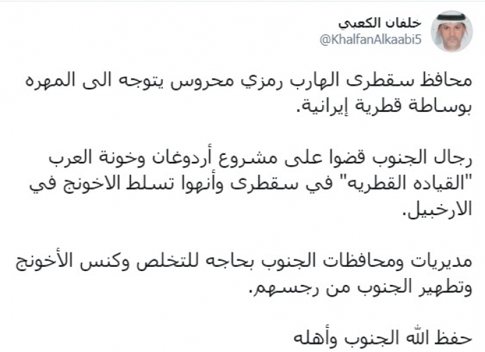 وكتب عبر تغريدة له على "تويتر" رصدها " المشهد العربي": "محافظ سقطرى الهارب رمزي محروس يتوجه إلى المهرة بوساطة قطرية إيرانية، رجال الجنوب قضوا على مشروع أردوغان وخونة العرب "القيادة القطرية" في سقطرى وأنهوا تسلط الإخونج في الأرخبيل.