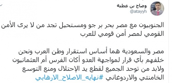 وكتب عبر تغريدة له على "تويتر" رصدها " المشهد العربي": "الجنوبيون مع مصر بحرا وبرا وجوا، ومستحيل تجد من لا يرى الأمن القومي لمصر أمن قومي للعرب".