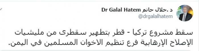 وكتب عبر تغريدة له على "تويتر" رصدها "المشهد العربي": "سقط مشروع تركيا - قطر بتطهير سقطرى من مليشيات الإصلاح الإرهابية فرع تنظيم الاخوان المسلمين في اليمن".