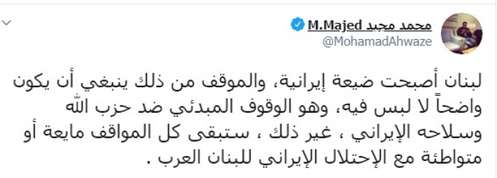 وكتب عبر تغريدة له على " تويتر" رصدها " المشهد العربي" :" لبنان أصبح ضيعة إيرانية، والموقف من ذلك ينبغي أن يكون واضحاً لا لبس فيه، وهو الوقوف المبدئي ضد حزب الله وسلاحه الإيراني، غير ذلك، ستبقى كل المواقف مايعة أو متواطئة مع الاحتلال الإيراني للبنان العرب".