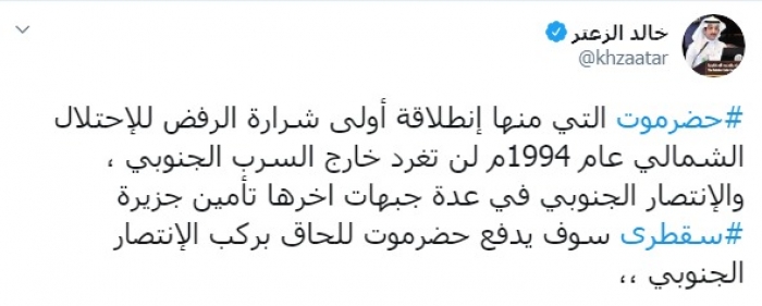 وكتب عبر تغريدة له على "تويتر" رصدها "المشهد العربي": "حضرموت التي منها انطلاقة أولى شرارة الرفض للاحتلال الشمالي عام 1994م لن تغرد خارج السرب الجنوبي، والانتصار الجنوبي في عدة جبهات آخرها تأمين جزيرة سقطرى، سوف يدفع حضرموت للحاق بركب الانتصار الجنوبي".