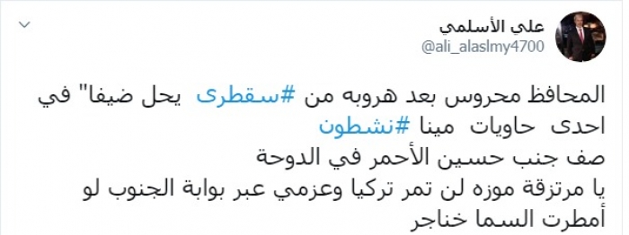وكتب عبر تغريدة له على "تويتر" رصدها "المشهد العربي": "المحافظ محروس بعد هروبه من سقطرى يحل ضيفا" في إحدى حاويات مينا نشطون".