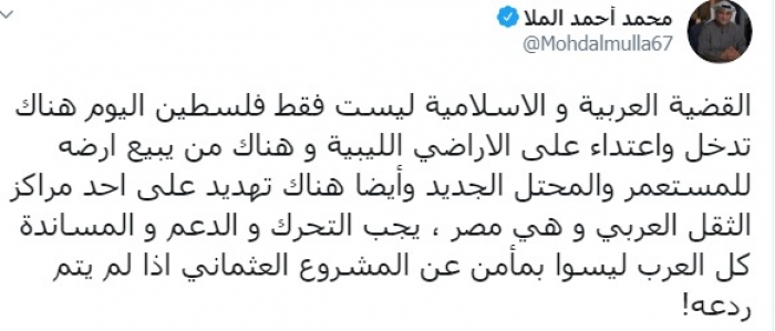 وكتب عبر تغريدة له على "تويتر" رصدها " المشهد العربي":"القضية العربية و الإسلامية ليست فقط فلسطين، اليوم هناك تدخل واعتداء على الأراضي الليبية و هناك من يبيع أرضه للمستعمر والمحتل الجديد وأيضا هناك تهديد على أحد مراكز الثقل العربي وهي مصر، يجب التحرك و الدعم و المساندة، كل العرب ليسوا بمأمن عن المشروع العثماني إذا لم يتم ردعه".