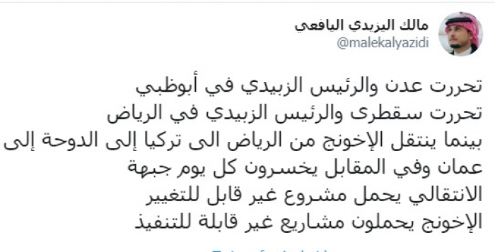 وكتب عبر تغريدة له على "تويتر" رصدها " المشهد العربي": "تحررت عدن والرئيس الزُبيدي في أبوظبي، تحررت سقطرى والرئيس الزُبيدي في الرياض، بينما ينتقل الإخونج من الرياض الى تركيا إلى الدوحة إلى عمان وفي المقابل يخسرون كل يوم جبهة".