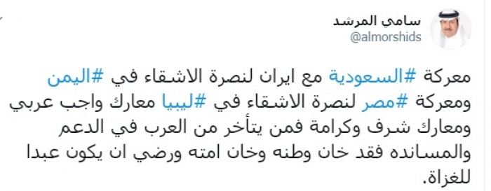 وكتب عبر تغريدة له على "تويتر" رصدها " المشهد العربي":"معركة السعودية مع إيران لنصرة الأشقاء في اليمن ومعركة مصر لنصرة الأشقاء في ليبيا معارك واجب عربي ومعارك شرف وكرامة فمن يتأخر من العرب في الدعم والمساندة فقد خان وطنه وخان أمته ورضي أن يكون عبدا للغزاة".