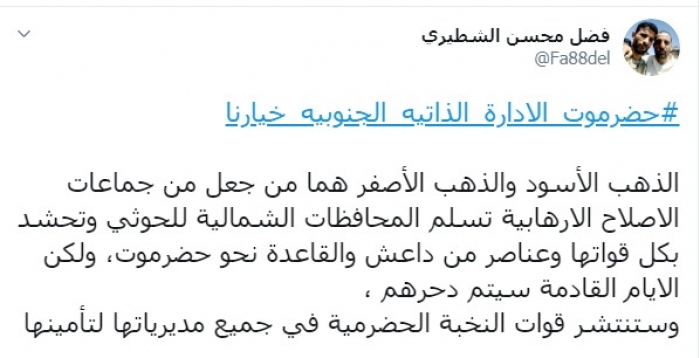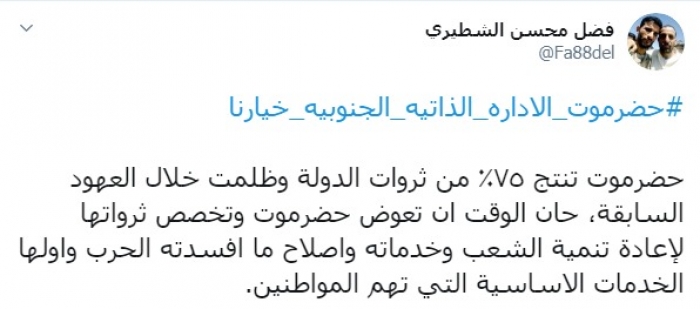وكتب عبر تغريدة له على "تويتر" رصدها " المشهد العربي": "حضرموت تنتج 75٪ من ثروات الدولة وظلمت خلال العهود السابقة، حان الوقت أن تعوض حضرموت وتخصص ثرواتها لإعادة تنمية الشعب وخدماته وإصلاح ما أفسدته الحرب وأولها الخدمات الأساسية التي تهم المواطنين".