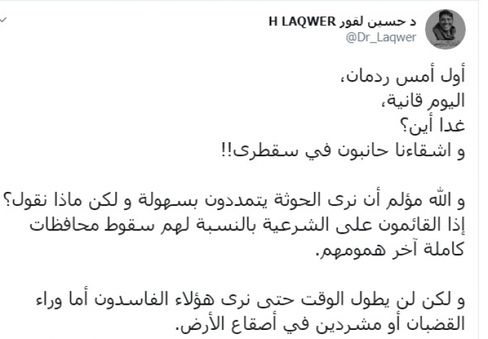 وكتب عبر تغريدة له على "تويتر" رصدها " المشهد العربي":"أول أمس ردمان، اليوم قانية، غدا أين؟و أشقاءنا حانبون في سقطرى".