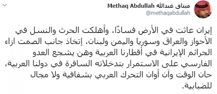 وكتب عبر تغريدة له على "تويتر" رصدها " المشهد العربي": "إيران عاثت في الأرض فسادًا، وأهلكت الحرث والنسل في الأحواز والعراق وسوريا واليمن ولبنان، اتخاذ جانب الصمت إزاء الجرائم الإيرانية في أقطارنا العربية، وهن يشجع العدو الفارسي على الاستمرار بتدخلاته السافرة في دولنا العربية، حان الوقت وآن أوان التحرك العربي بشفافية ولا مجال للضبابية".