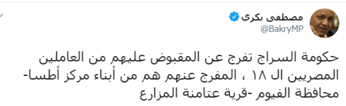 وكتب عبر تغريدة له على "تويتر" رصدها " المشهد العربي": "حكومة السراج تفرج عن المقبوض عليهم من العاملين المصريين الـ ١٨ ، المفرج عنهم هم من أبناء مركز أطسا- محافظة الفيوم -قرية عتامنة المزارع".