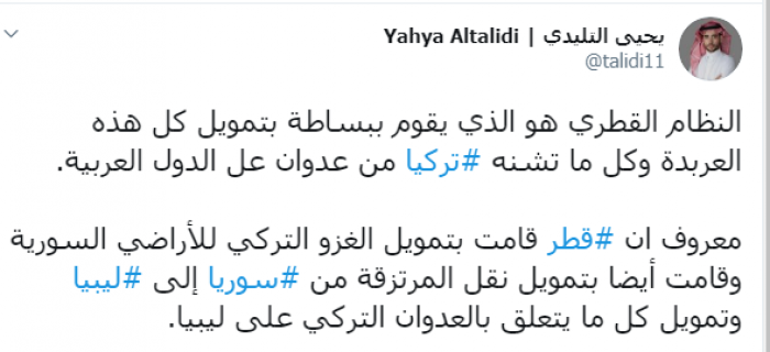 وكتب عبر تغريدة له على "تويتر" رصدها " المشهد العربي": "النظام القطري هو الذي يقوم ببساطة بتمويل كل هذه العربدة وكل ما تشنه تركيا من عدوان على الدول العربية".