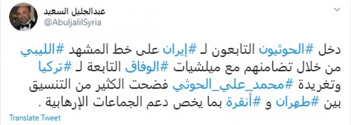 وكتب في تغريدة عبر "تويتر" رصدها "المشهد العربي": "دخل الحوثيون التابعون لإيران على خط المشهد الليبي من خلال تضامنهم مع مليشيات الوفاق التابعة لـ تركيا".