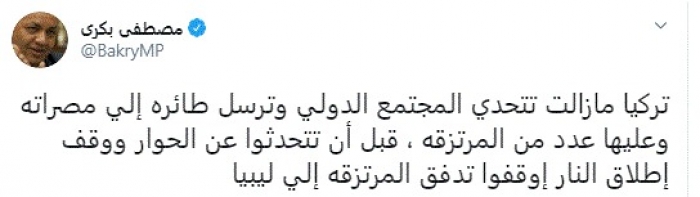 طالب الإعلامي والبرلماني المصري مصطفى بكري، اليوم، بوقف تدفق المرتزقة إلى ليبيا، مؤكدًا أن تركيا ما زالت تتحدى المجتمع الدولي بدعم المليشيات الإرهابية في ليبيا بالمرتزقة.