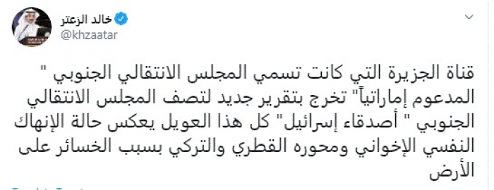 وكتب في تغريدة عبر "تويتر" رصدها "المشهد العربي": "قناة الجزيرة التي كانت تسمي المجلس الانتقالي الجنوبي المدعوم إماراتيًا تخرج بتقرير جديد لتصف المجلس الانتقالي الجنوبي أصدقاء إسرائيل".