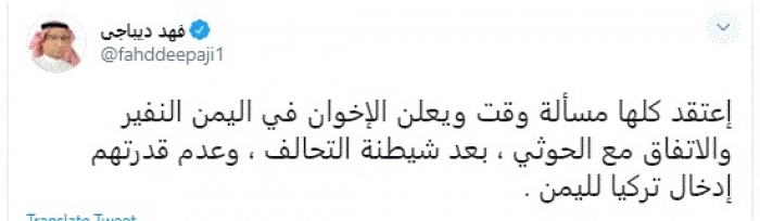 وقال في تغريدة عبر "تويتر" رصدها "المشهد العربي": "اعتقد كلها مسألة وقت ويعلن الإخوان في اليمن النفير والاتفاق مع الحوثي، بعد شيطنة التحالف، وعدم قدرتهم إدخال تركيا لليمن".
