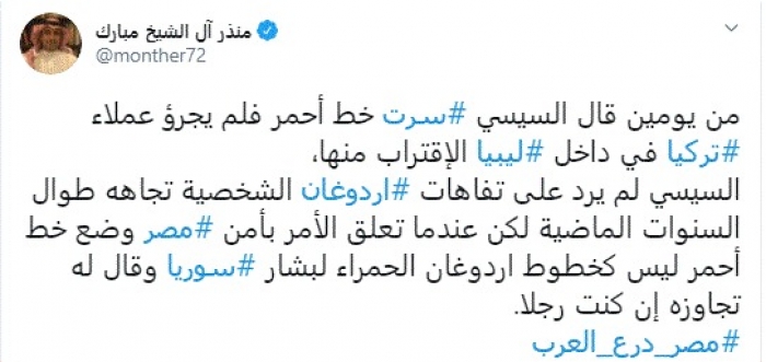 وقال في تغريدة عبر "تويتر" رصدها "المشهد العربي": "من يومين قال السيسي سرت خط أحمر فلم يجرؤ عملاء تركيا في داخل ليبيا الاقتراب منها".