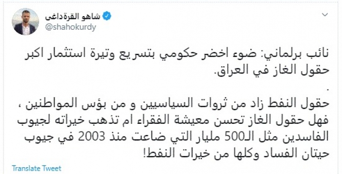 وقال في تغريدة عبر "تويتر" رصدها "المشهد العربي": "نائب برلماني: ضوء أخضر حكومي بتسريع وتيرة استثمار أكبر حقول الغاز في العراق. حقول النفط زاد من ثروات السياسيين ومن بؤس المواطنين، فهل حقول الغاز تحسن معيشة الفقراء أم تذهب خيراته لجيوب الفاسدين مثل الـ500 مليار التي ضاعت منذ 2003 في جيوب حيتان الفساد وكلها من خيرات النفط".