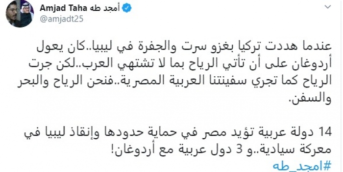 وأضاف: "14 دولة عربية تؤيد مصر في حماية حدودها وإنقاذ ليبيا في معركة سيادية..و 3 دول عربية مع أردوغان".