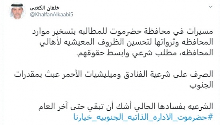 وقال في تغريدة عبر "تويتر" رصدها "المشهد العربي": "مسيرات في محافظة حضرموت للمطالبة بتسخير موارد المحافظة وثرواتها لتحسين الظروف المعيشية لأهالي المحافظة، مطلب شرعي وأبسط حقوقهم".