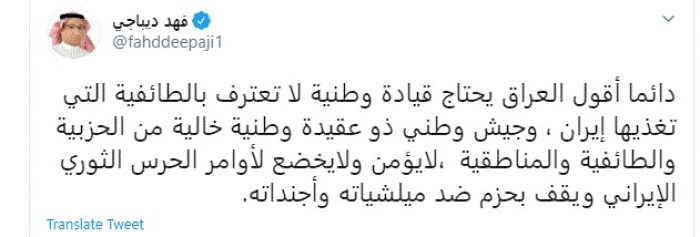 وكتب في تغريدة عبر "تويتر" رصدها "المشهد العربي": "دائمًا أقول العراق يحتاج قيادة وطنية لا تعترف بالطائفية التي تغذيها إيران، وجيش وطني ذو عقيدة وطنية خالية من الحزبية والطائفية والمناطقية، لا يؤمن ولا يخضع لأوامر الحرس الثوري الإيراني ويقف بحزم ضد ميلشياته وأجنداته".
